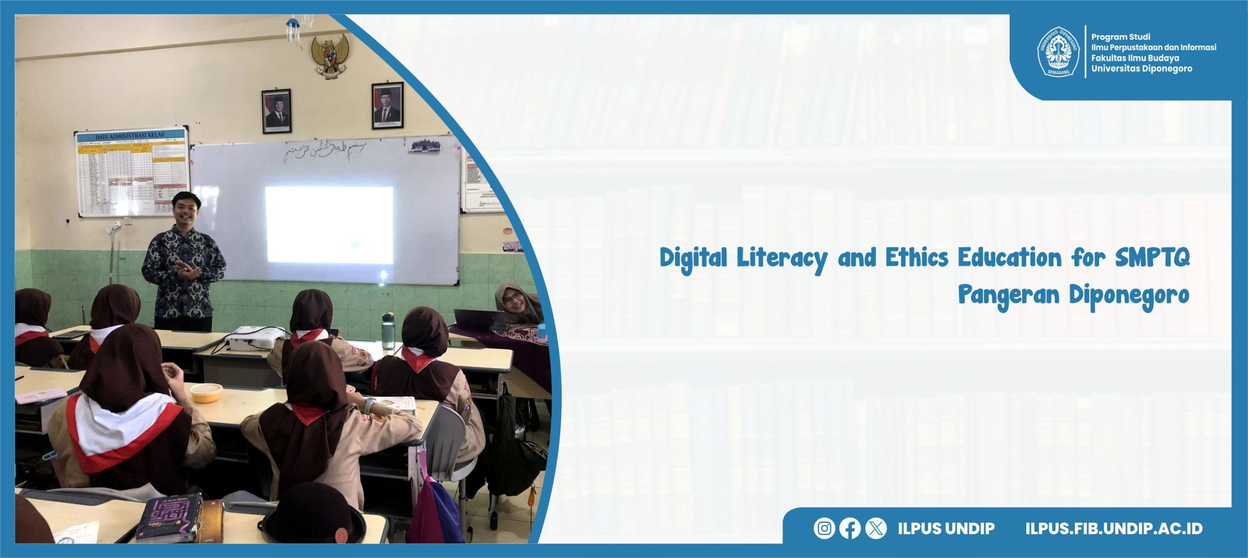 Semarang 24 April 2025 – In today’s digital era, the ability to understand and use information technology wisely is a fundamental need. Digital literacy and digital ethics are two important aspects that must be owned by the younger generation to play an active and responsible role in cyberspace. As a form of commitment to increase awareness and understanding, lecturers and students of Library and Information Science at Diponegoro University held a community service activity at SMPTQ Pangeran Diponegoro Semarang, with the theme “Digital Literacy and Ethics Education for Students.”