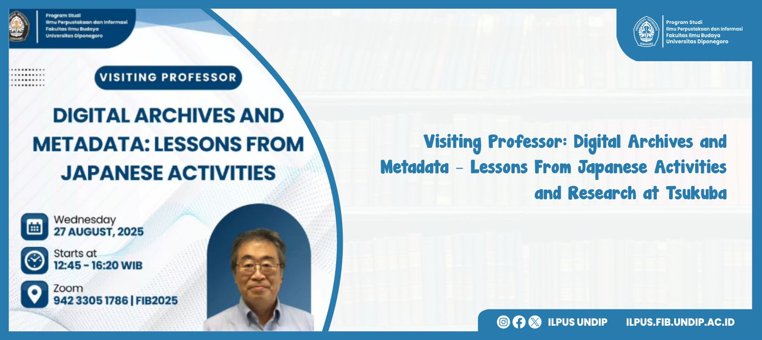 Semarang, August 27, 2025 – The Library and Information Science Study Program, Faculty of Humanities, Universitas Diponegoro, held a public lecture through a visiting professor event with the theme “Digital Archives and Metadata—Lessons from Japanese Activities and Research at Tsukuba,” presented by Prof. Shigeo Sugimoto, Professor Emeritus from the University of Tsukuba, Japan