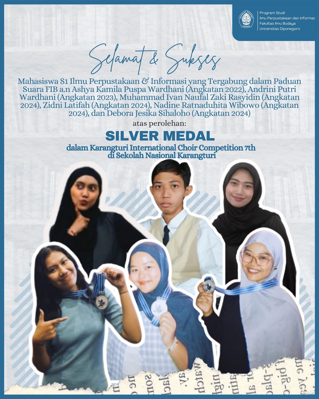 Semarang, 26 November 2025 – Undergraduate students majoring in Library & Information Science who are members of the FIB Choir, namely Ashya Kamila Puspa Wardhani (2022), Andrini Putri Wardhani (2023), Muhammad Ivan Naufal Zaki Rasyidin (2024), Zidni Latifah (2024), Nadine Ratnaduhita Wibowo (2024), and Debora Jesika Sihaloho (2024) for winning the SILVER MEDAL at the 7th Karangturi International Choir Competition at Karangturi National School.