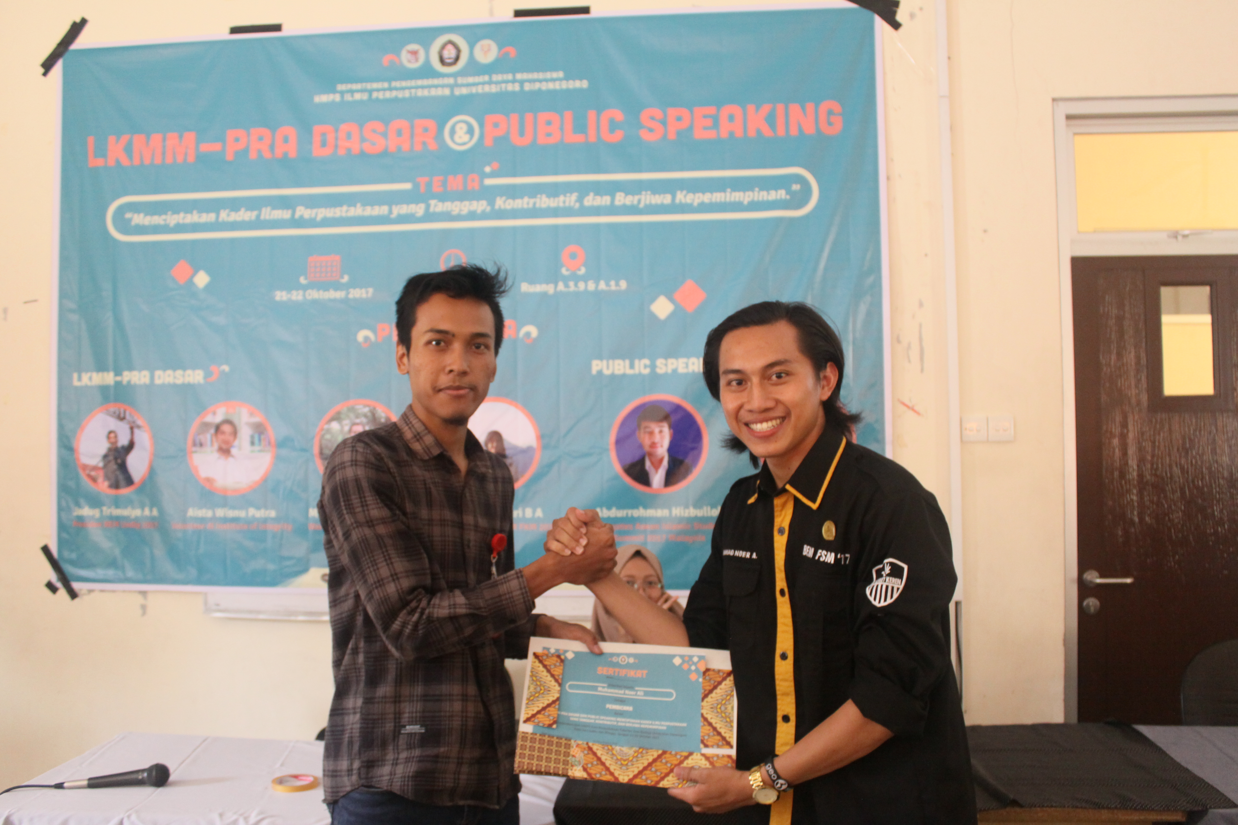 LKMM-PD dan Public Speaking ini termasuk dalam rangkaian kaderisasi untuk Mahasiswa baru Ilmu Perpustakaan di awal tahun masuk. Tujuan diadakannya LKMM-PD adalah untuk membekali mahasiswa baru dengan keterampilan dasar dalam berkomunikasi, mengenal potensi diri, mengembangkan sifat kritis dan memposisikan diri secara efektif dalam menempatkan dirinya di kehidupan kampus yang baru mereka jejaki