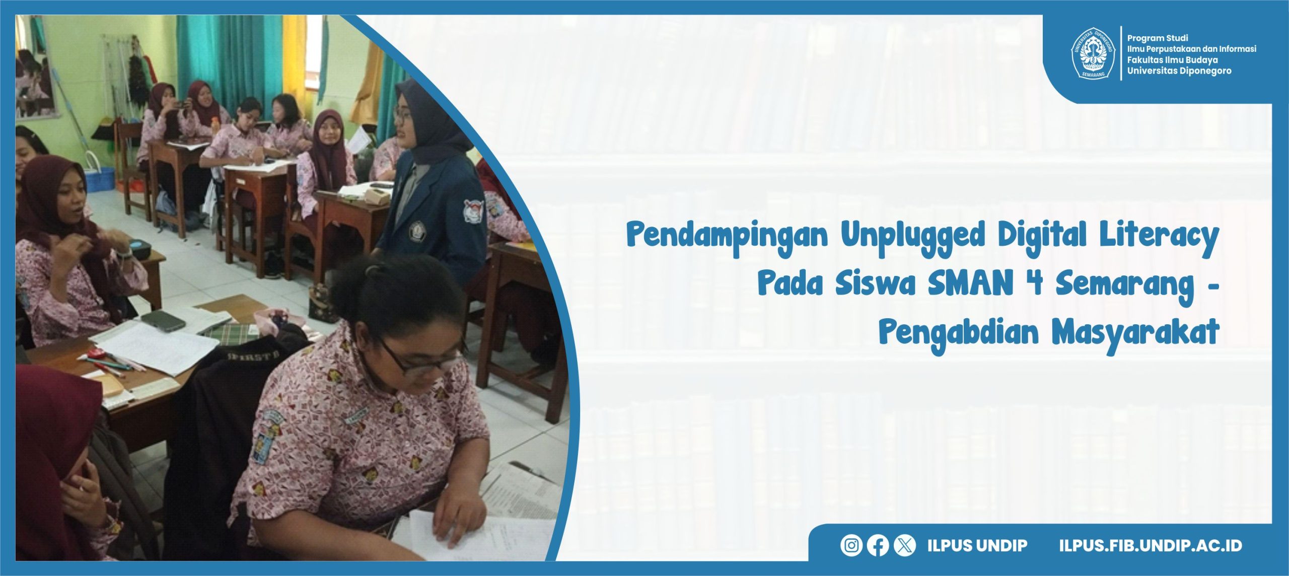 Semarang (21/11/2024) – Literasi digital menjadi keterampilan penting bagi siswa, melalui kegiatan pengabdian masyarakat yang dilakukan oleh mahasiswa Ilmu Perpustakaan dan Informasi, Universitas Diponegoro, mampu meningkatkan kemampuan siswa SMAN 4 Semarang dalam memahami dan menggunakan teknologi secara bijak.