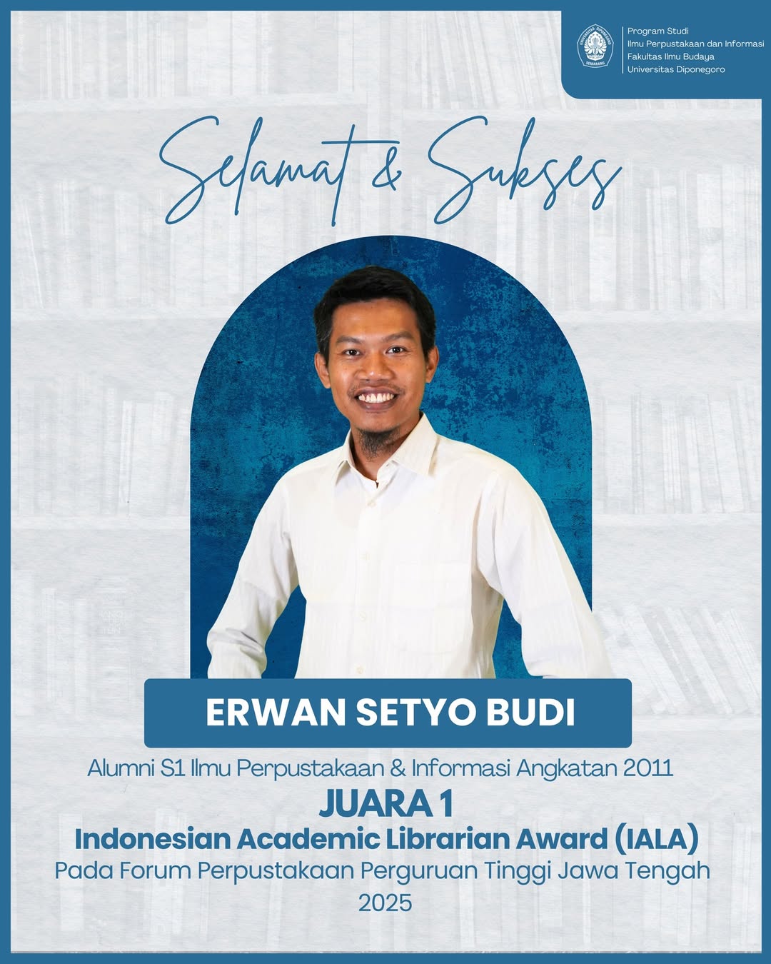 Selamat dan sukses kepada Erwan Setyo Budi, Alumni S1 Ilmu Perpustakaan & Informasi Undip Angkatan 2011, atas perolehan Juara 1 Indonesian Academic Librarian Award (IALA) 2025 pada Forum Perpustakaan Perguruan Tinggi Jawa Tengah.